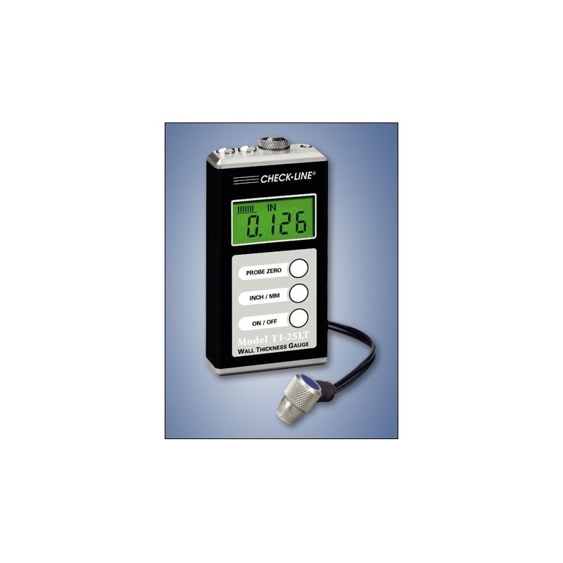 Medidas TI-25M en todos los plásticos metales, cerámica, vidrio y más materiales rigidos rígidas. Proporciona modos de escaneo de lectura individual y, cuando la sonda se arrastra sobre un área de medición grande. Se muestra la lectura mínima registrada durante el "escaneo".